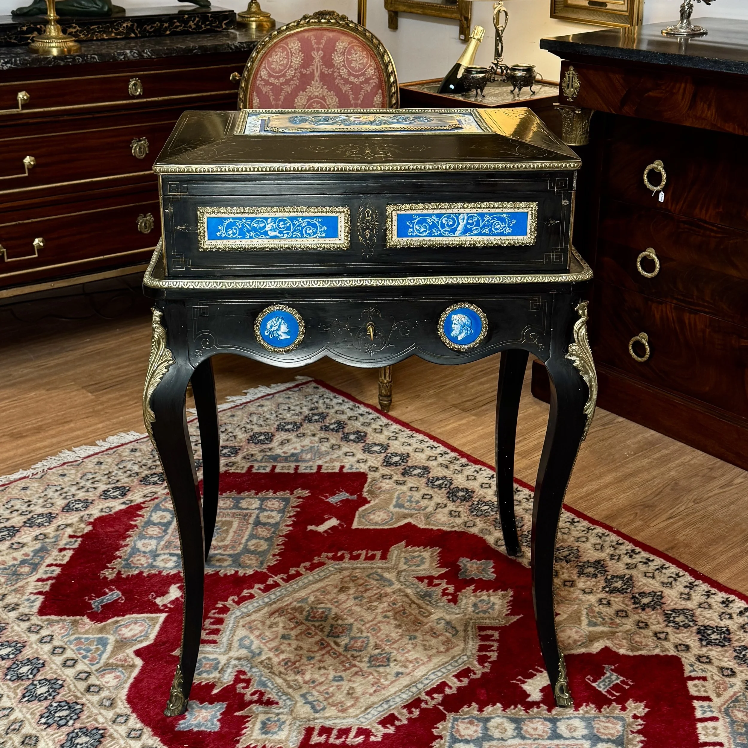 Boite à bijoux d’époque Napoléon III en poirier noirci, incrusté de plaques de porcelaine et décorée de bronzes dorés, le dessus ouvrant sur un intérieur en tissus capitonné. 1 tiroir en façade.