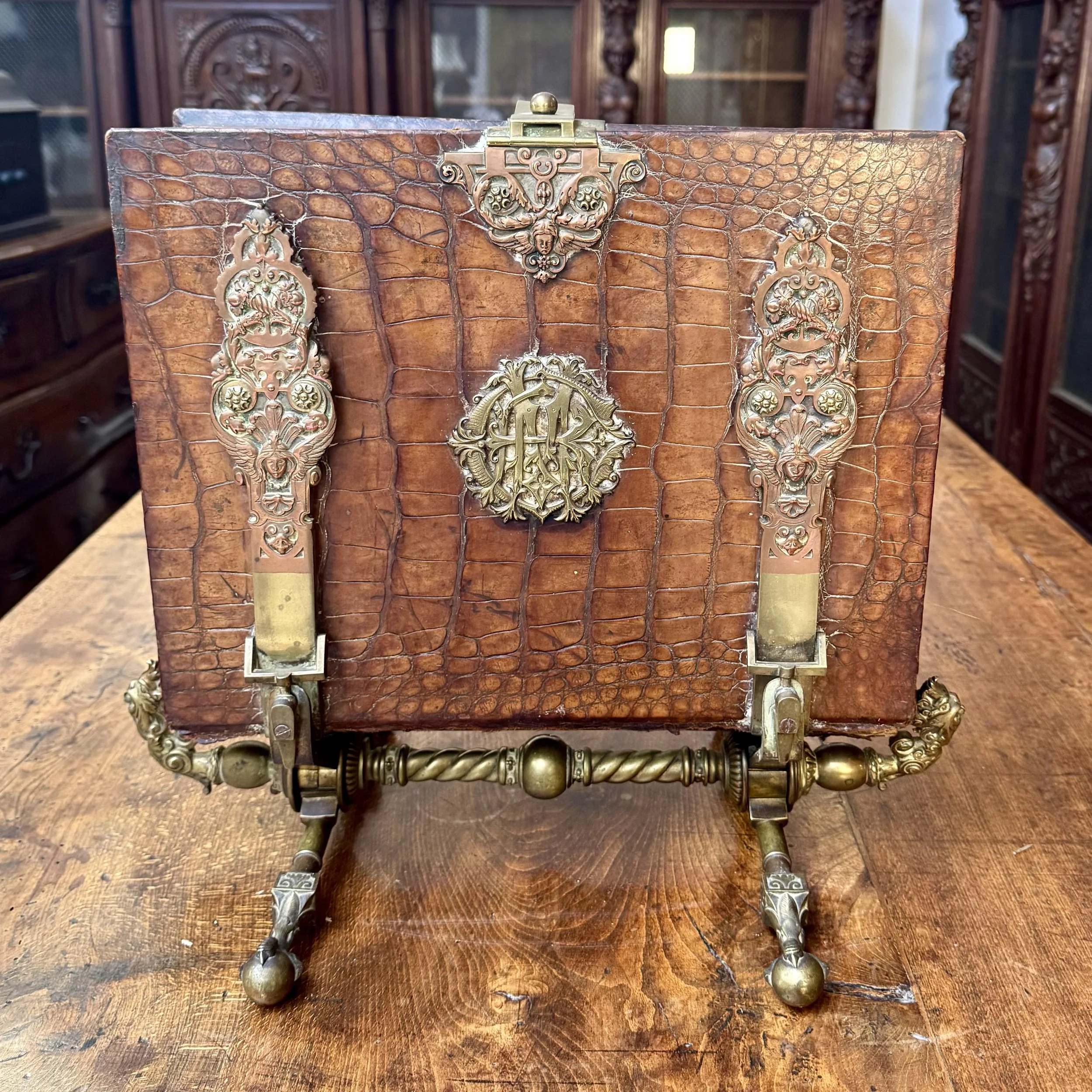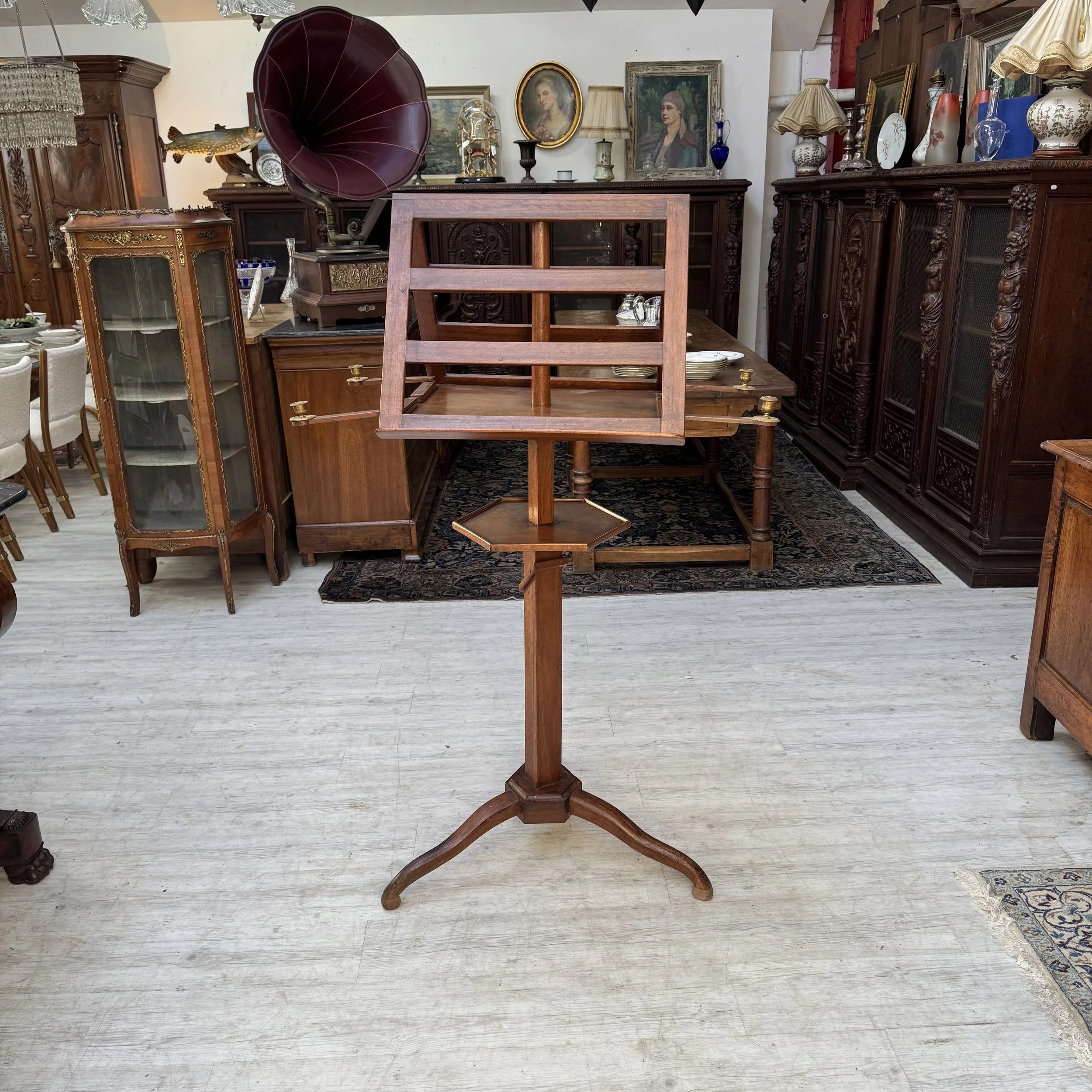Très beau lutrin du XIXème siècle, d’époque Louis Philippe en noyer, monté sur une crémaillère afin de changer de hauteur, également tournant et décoré de quatre bras articulé ornés à chaque extrémités de petits bougeoirs en bronze doré.