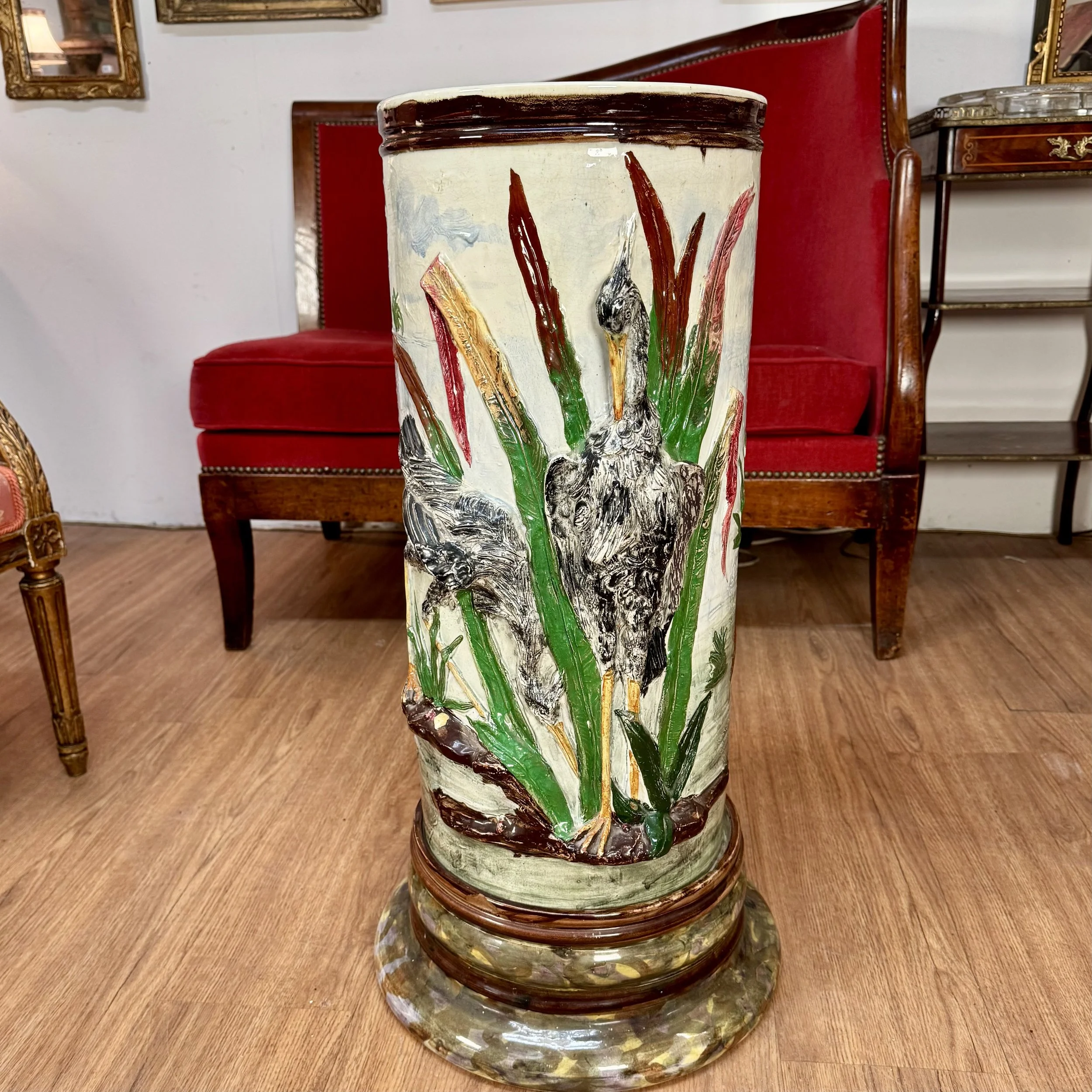 Dans le gout de Delphin Massier ce porte parapluies de grande taille est à décors en relief de roseaux et de grues cendrées. Composé de deux parties.