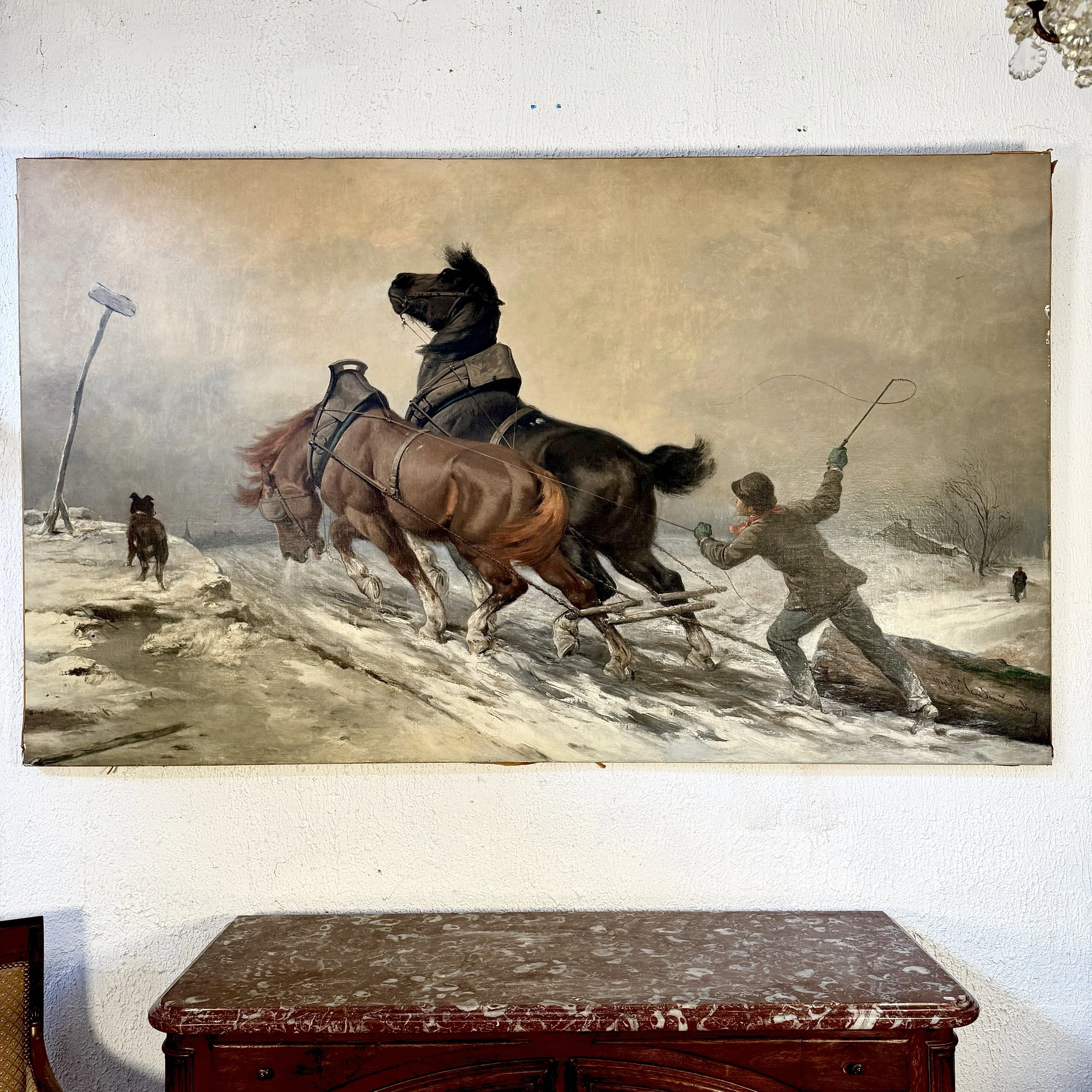 Peinture vers 1850 représentant un bucheron, ses chevaux et son chien.