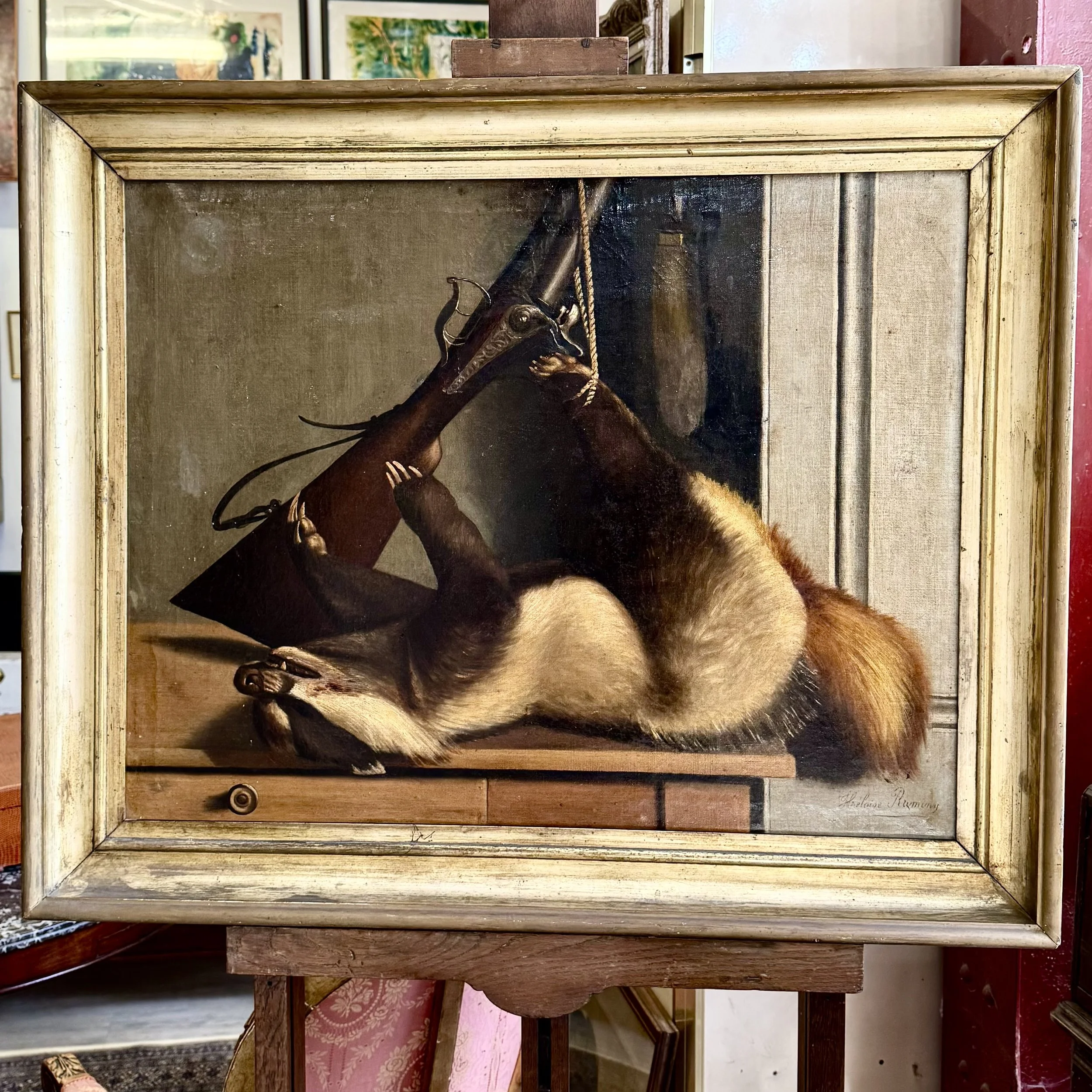 Huile sur toile représentant un blaireau au retour de chasse, signé par Héloïse Rumigny, restauration ancienne visible au dos.