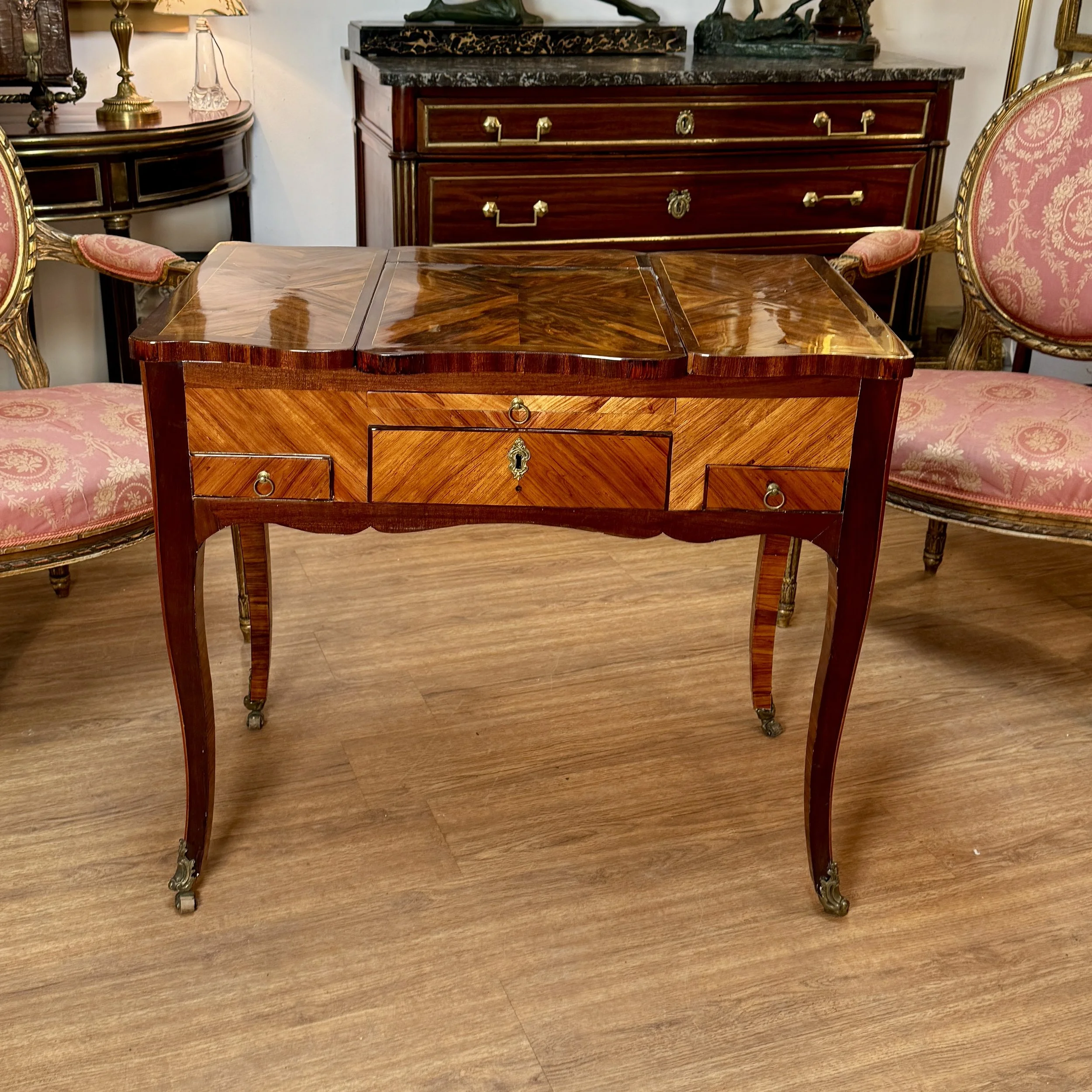 Elégante coiffeuse en placage de bois de violette, sycomore et filets de citronnier. 2 tiroirs et 1 tirette en façade, ouvrant par 3 parties avec miroir d’époque.