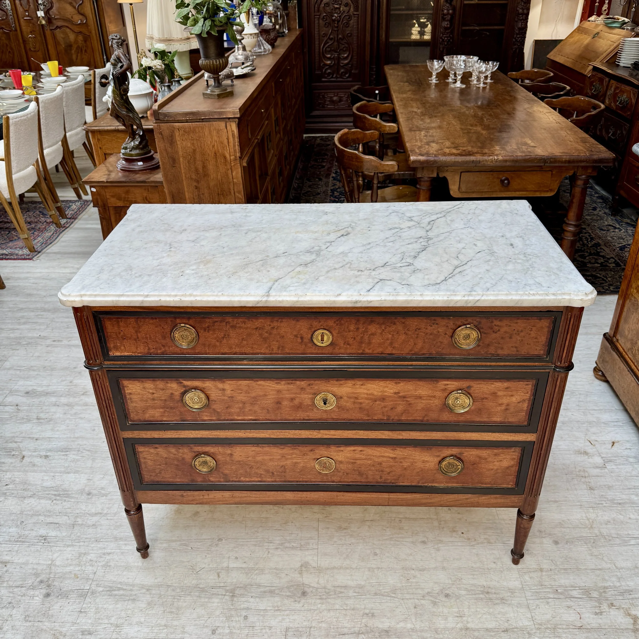 Elégante commode du XVIIIème siècle en acajou moucheté et bois noirci, marbre blanc de Carare, entrées et poignées en bronze doré.