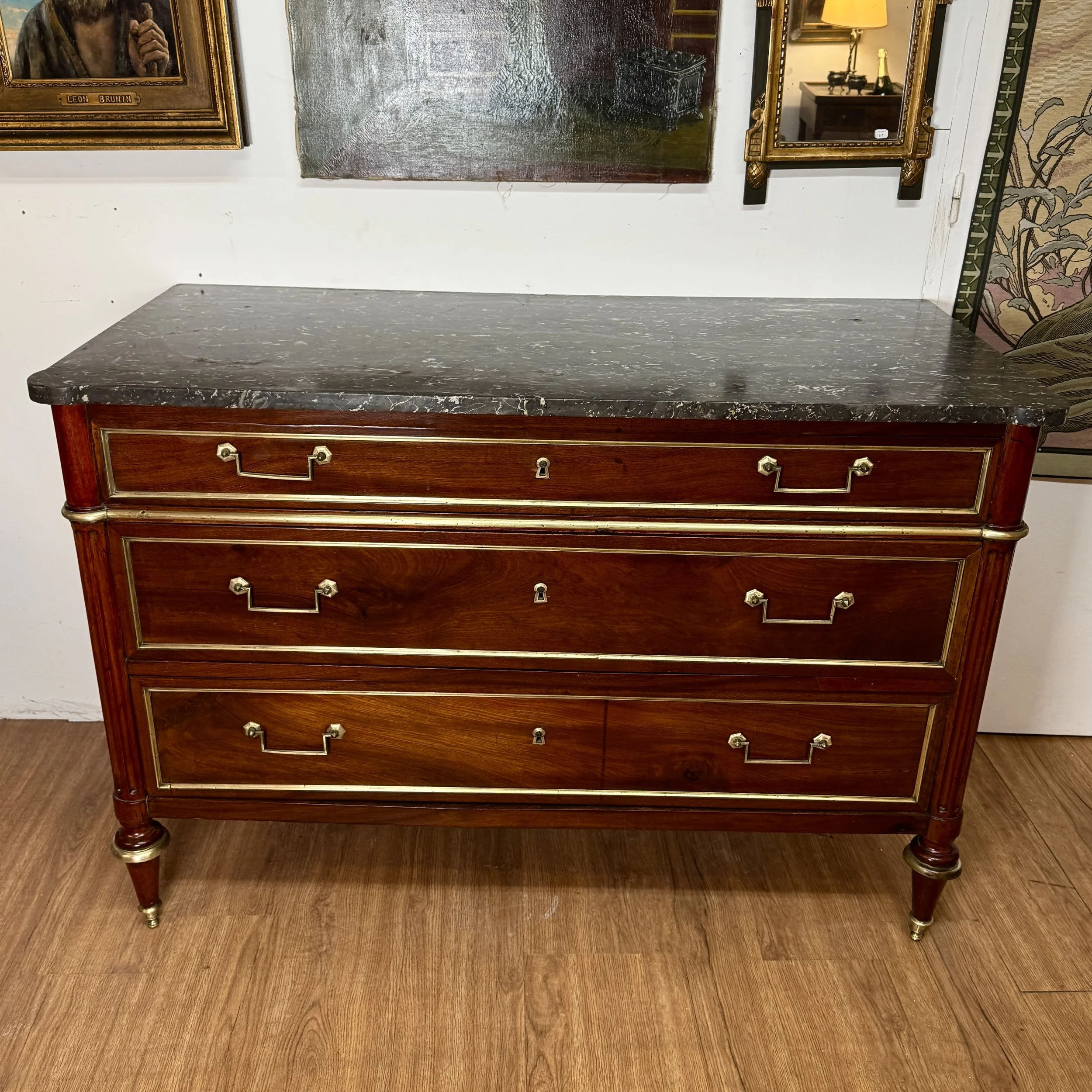 Très belle commode d’époque Louis XVI en acajou, entièrement restaurée, chaque tiroirs est décorés de filets en laiton, entrées et poignées en bronze doré, marbre gris Saint-Anne.