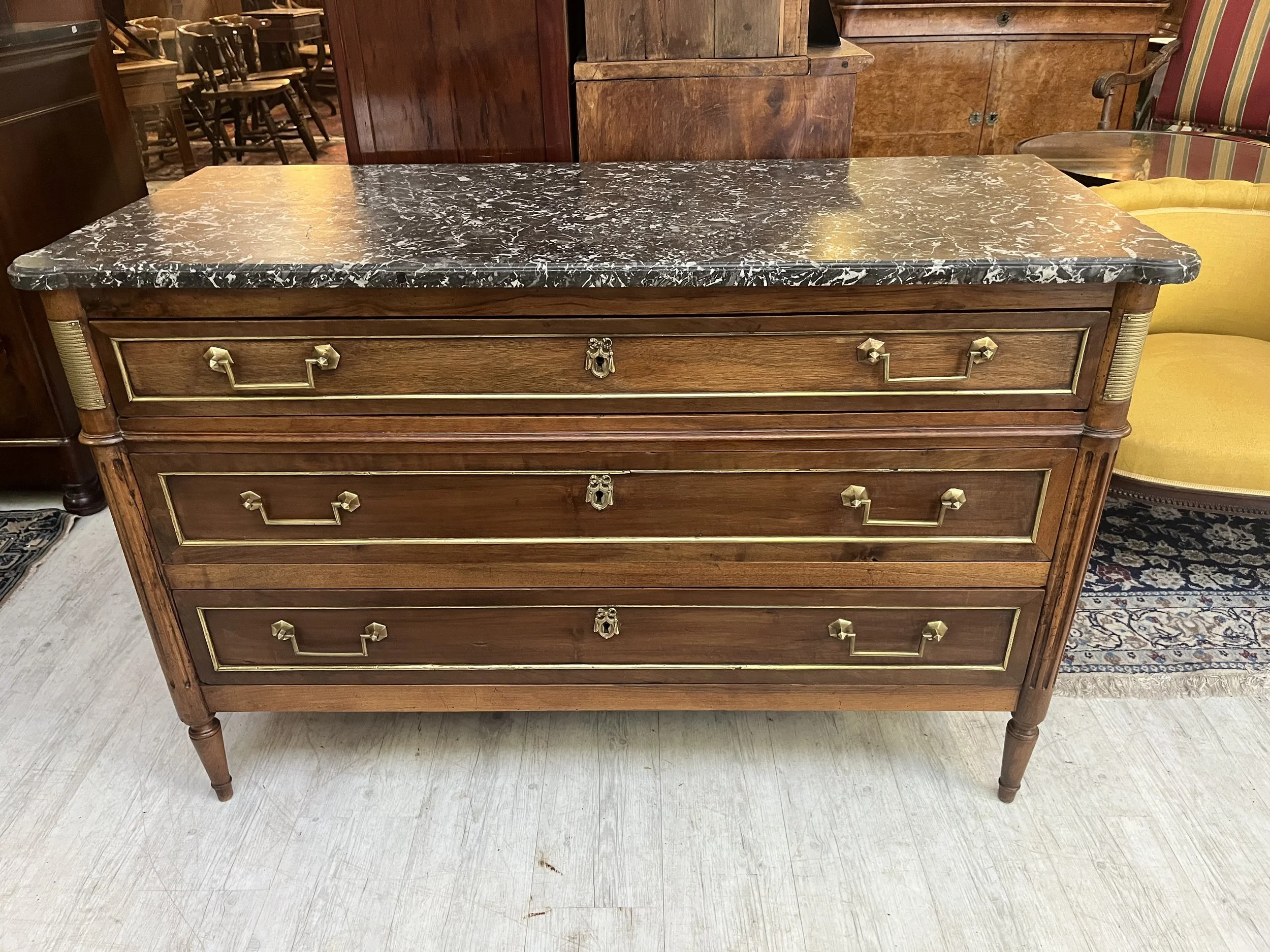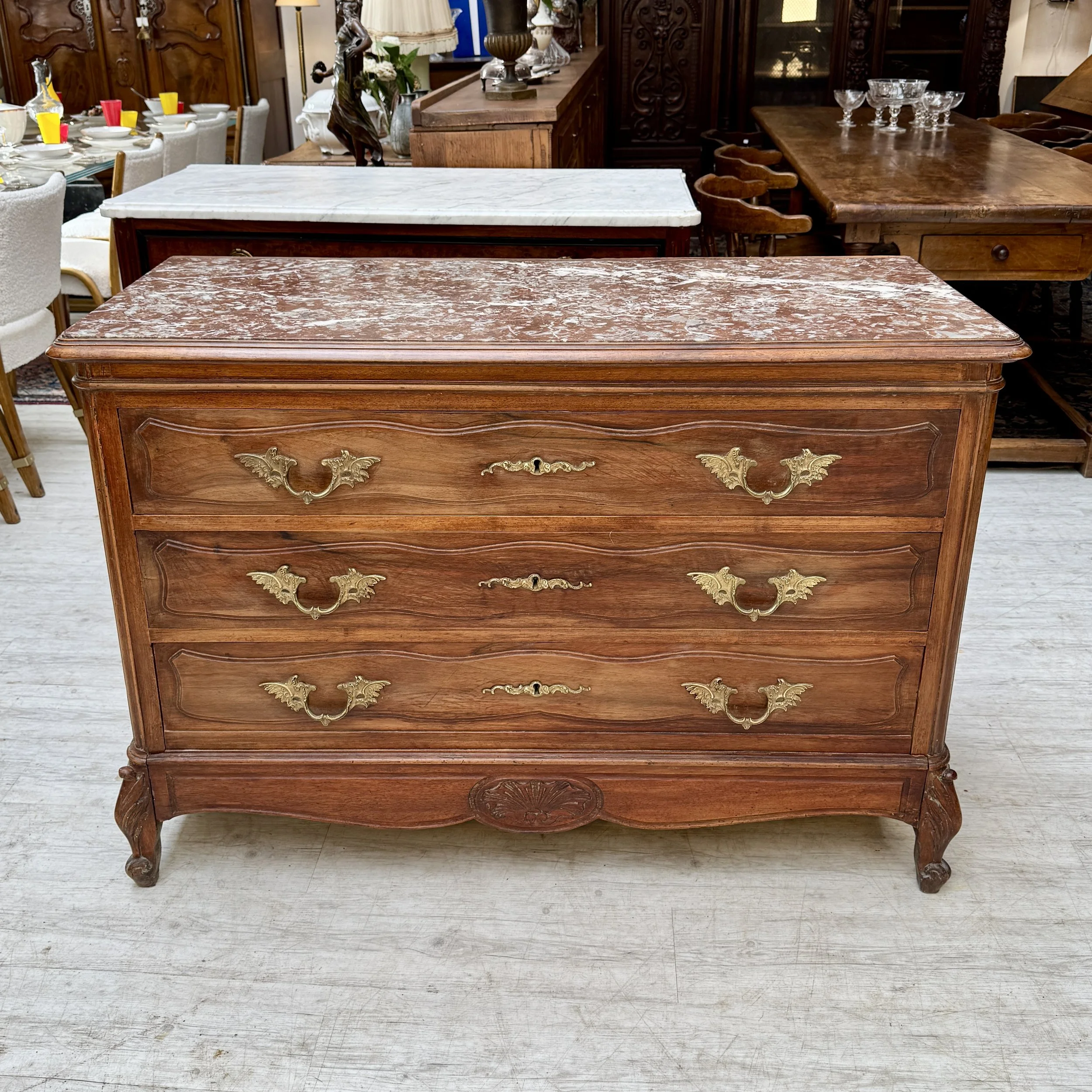 Elégante commode datant du XIXème en noyer, marbre “Coquillier de Bilbao”, entrées et poignées en bronze doré.