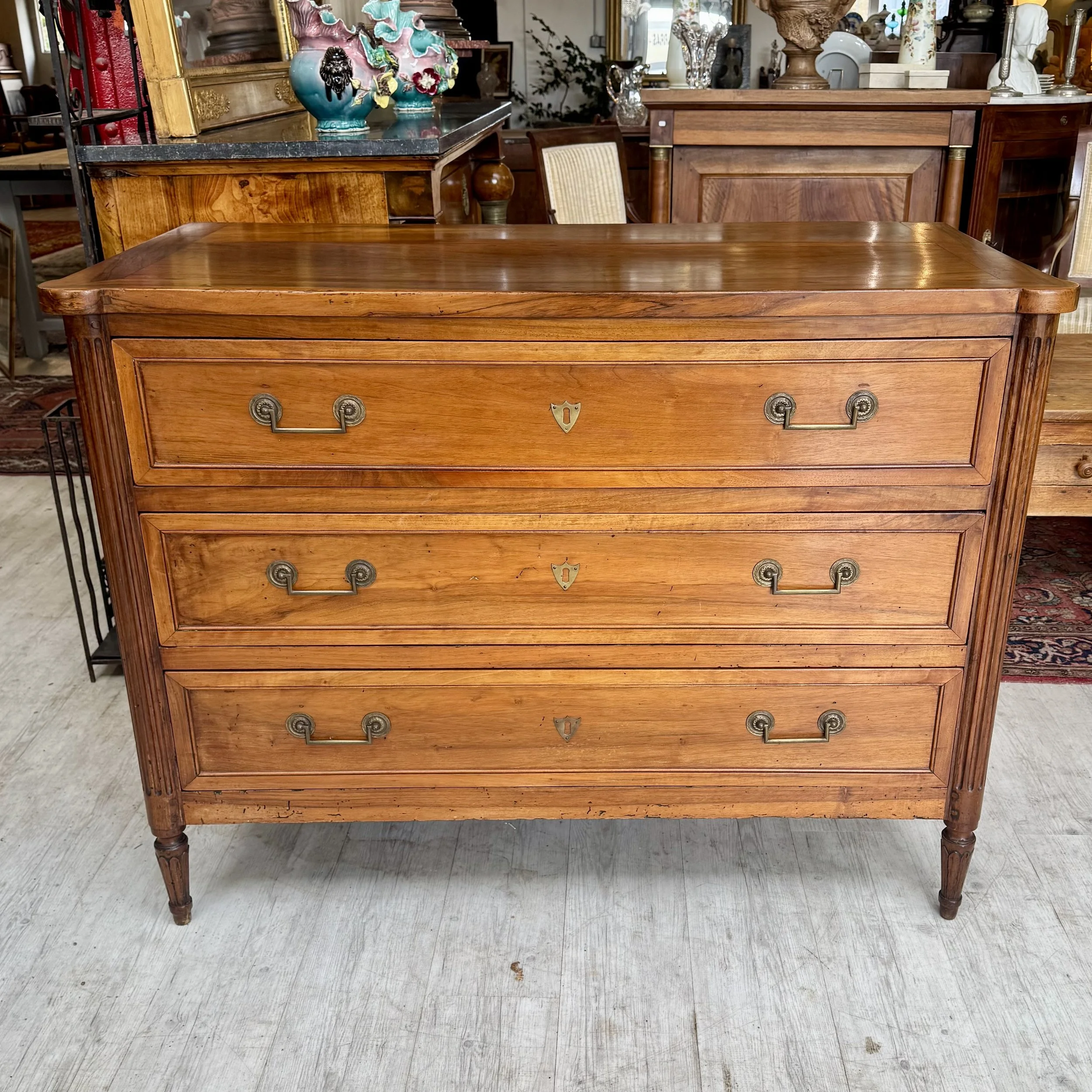 Très belle commode d’époque Louis XVI en noyer blond veiné, 3 tiroirs, entrées et poignées en bronze d’origine