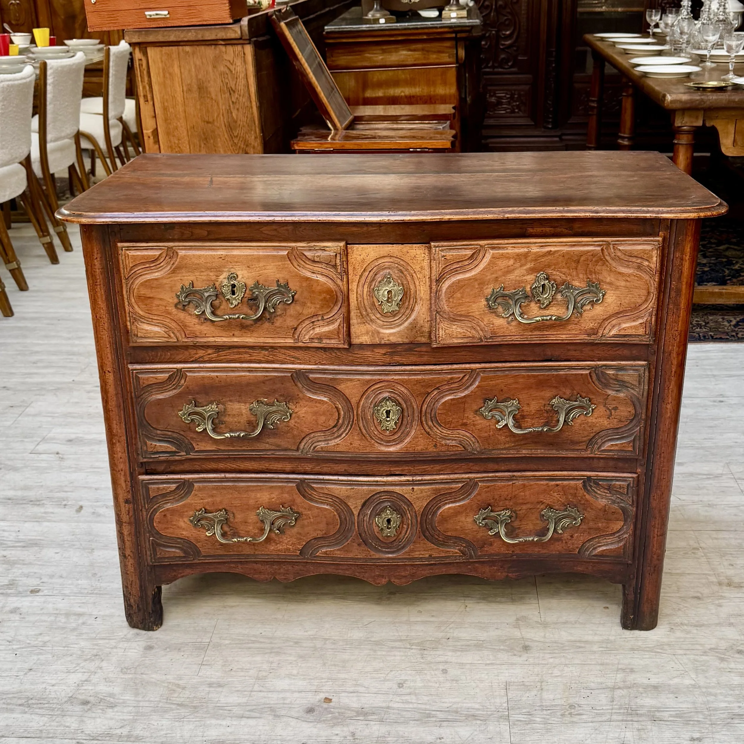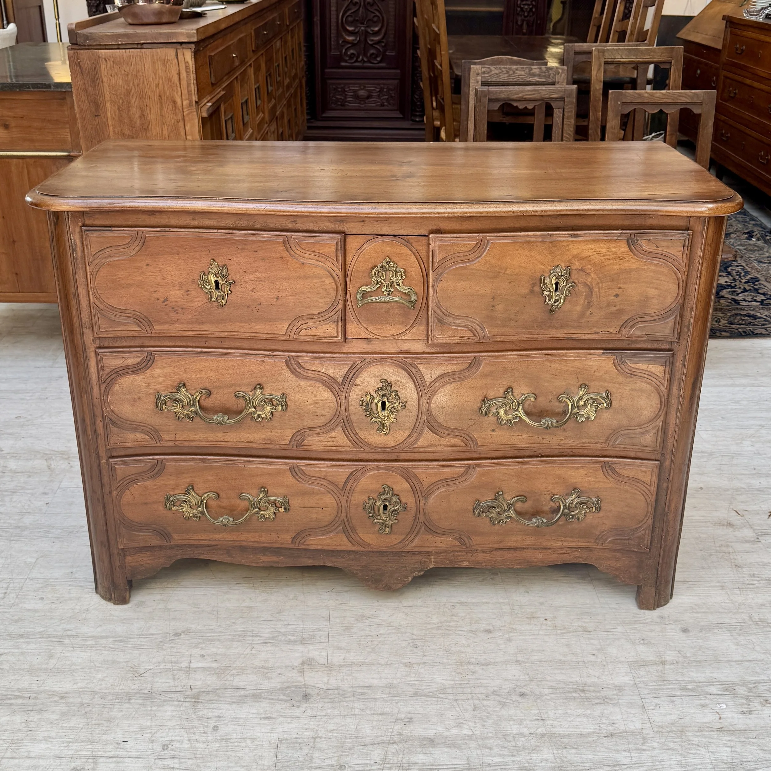 Très belle commode d’époque Régence en noyer, 3 tiroirs en haut dont un petit dissimulé entre les 2, 2 grands en dessous, entrées et poignées en bronze d’origine