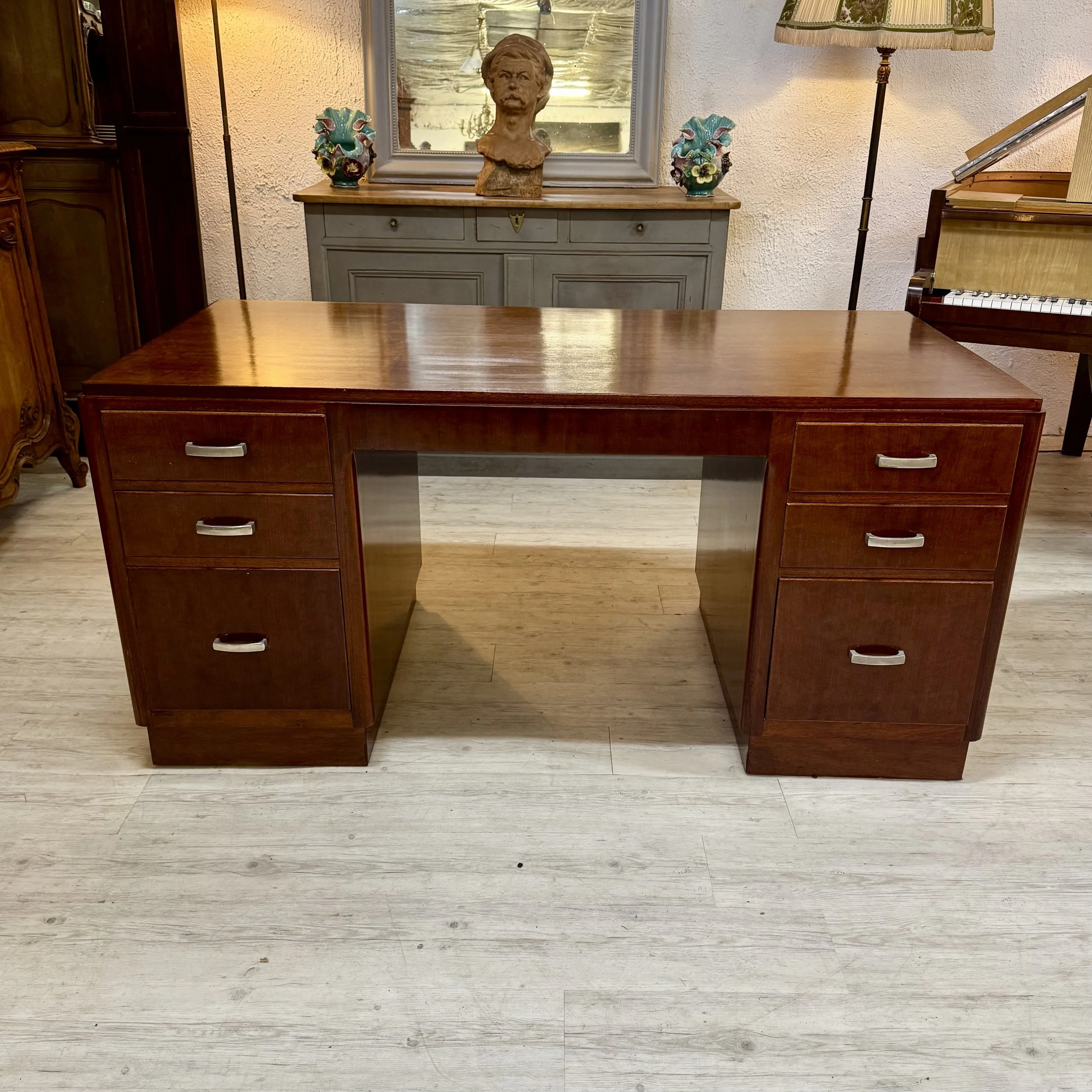 Bureau en placage d’acajou, 6 tiroirs avec poignées cromées et 2 tirettes ouvrant de chaque coté.
