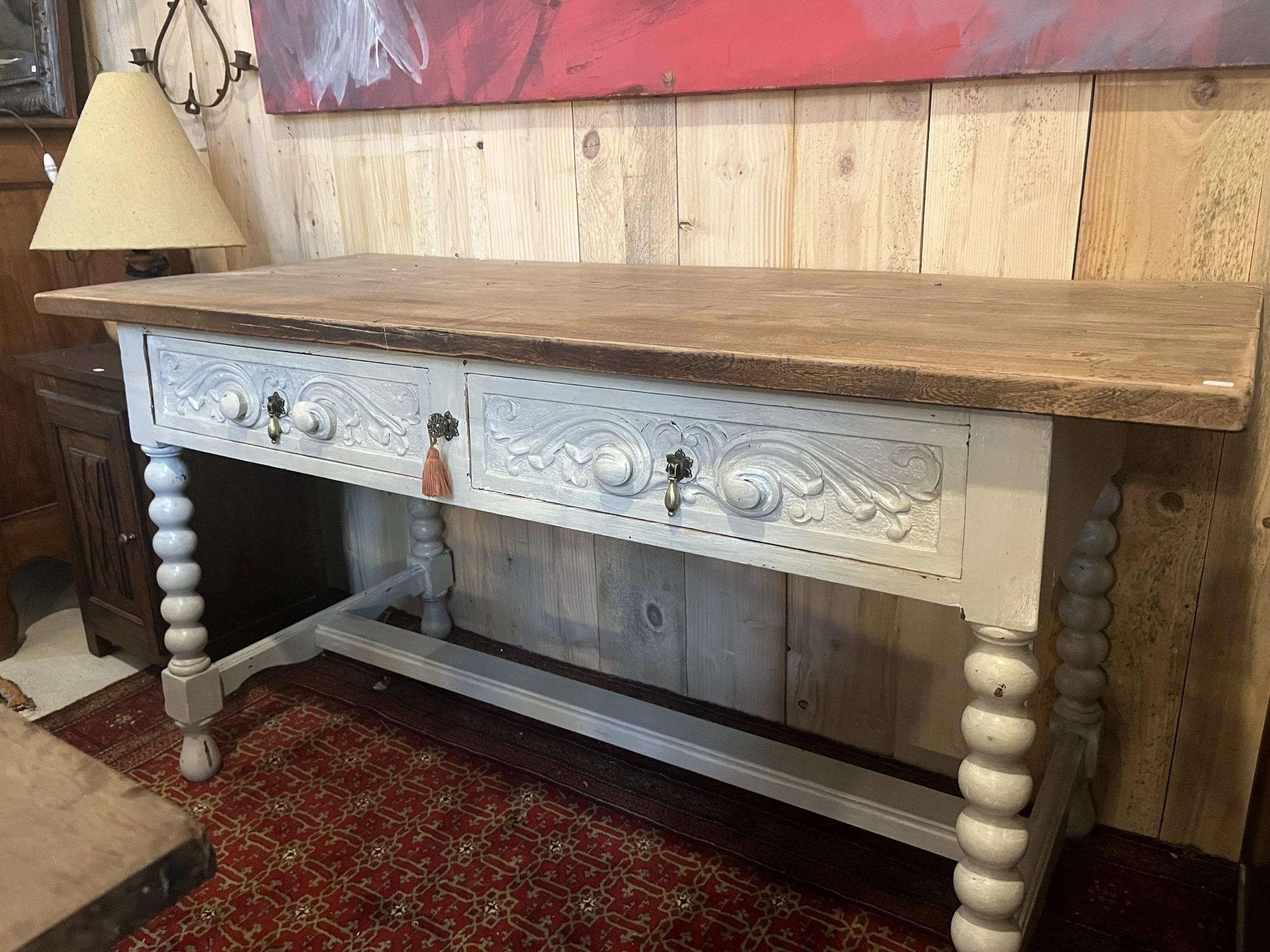 Bureau ancien Henri II, ceinture et piètement repeint, plateau bois.
